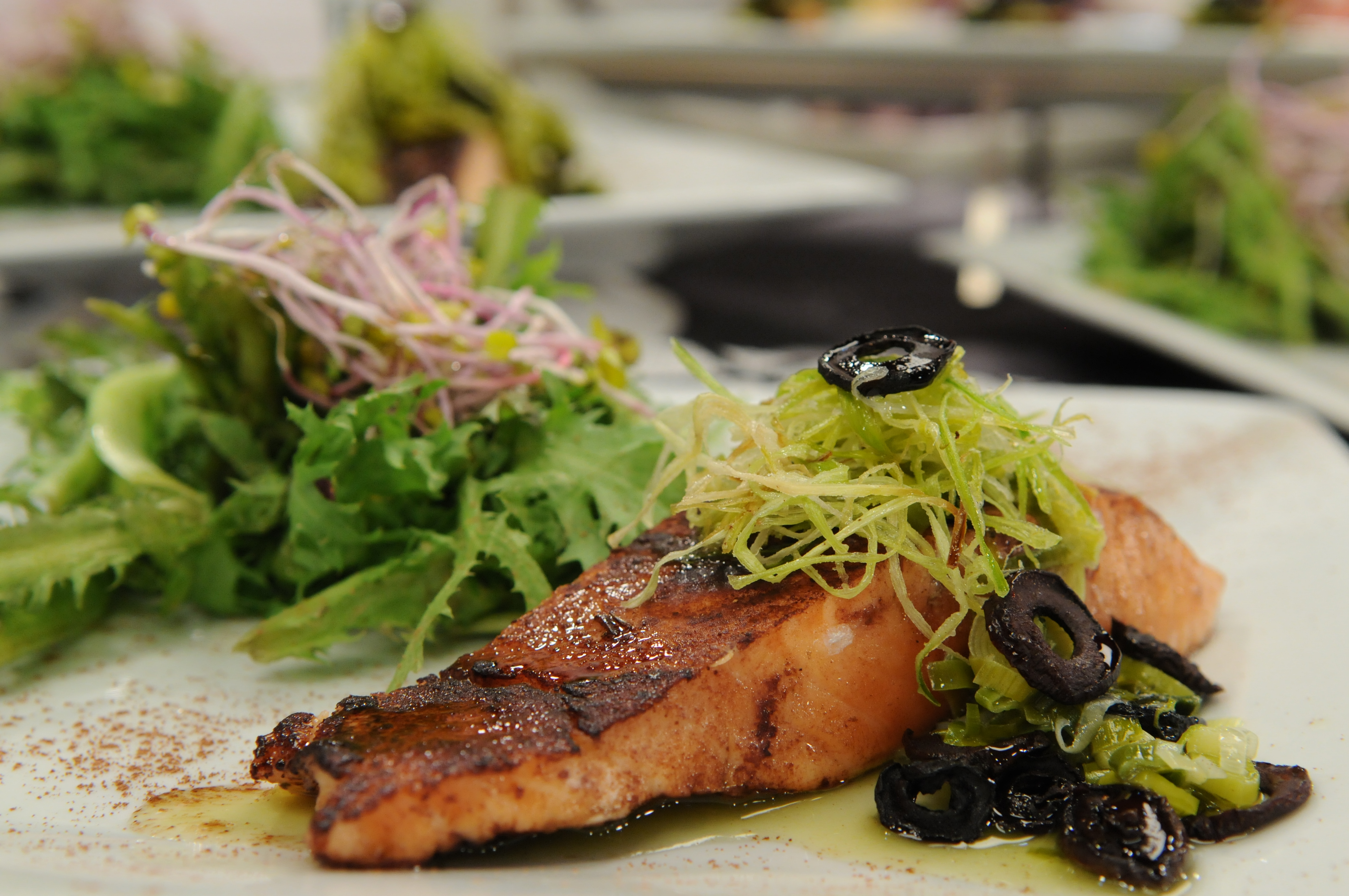 Rehogar los puerros y las aceitunas con aceite de oliva. Desglasar con vino blanco. Presentar con el pescado y terminar con hojas verdes.