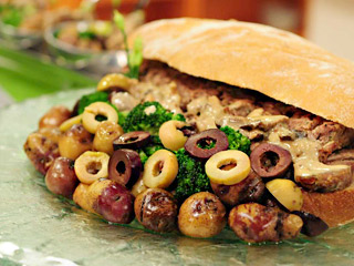 2. Guarnición. Hervir el brócoli en pequeñas piezas. Hacer lo mismo con los papines. Una vez fríos, sartenear en aceite de oliva con láminas de ajo y aceitunas negras.
